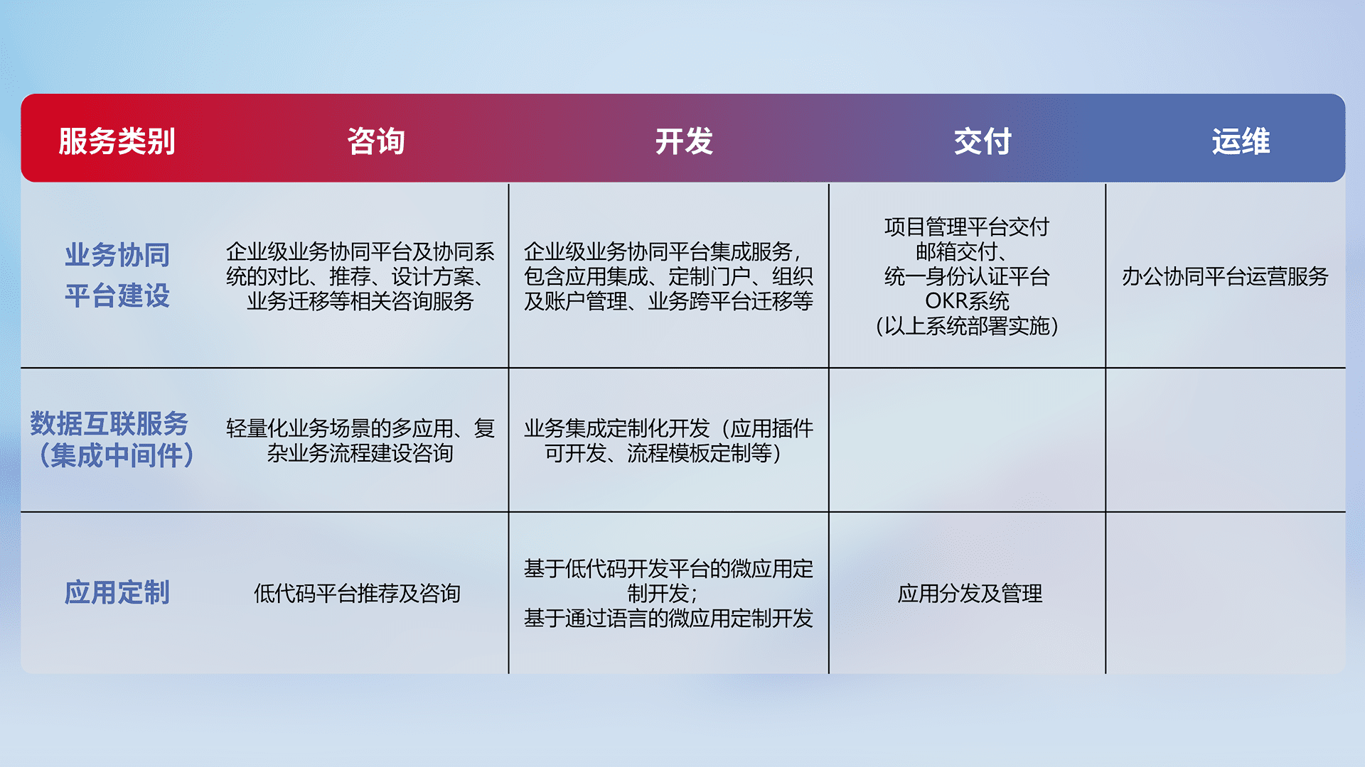 针对钉钉、、、、企微、、IDaas等平台级产品提供产品的规划、、方案、、、交付、、定制化开发等服务,,实现如统一协同办公、、、智能客户服务、、、、混合会议管理、、智能数据查询、、等业务场景,,,,实现数字化转型。。